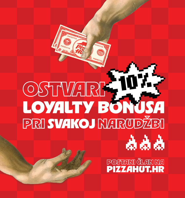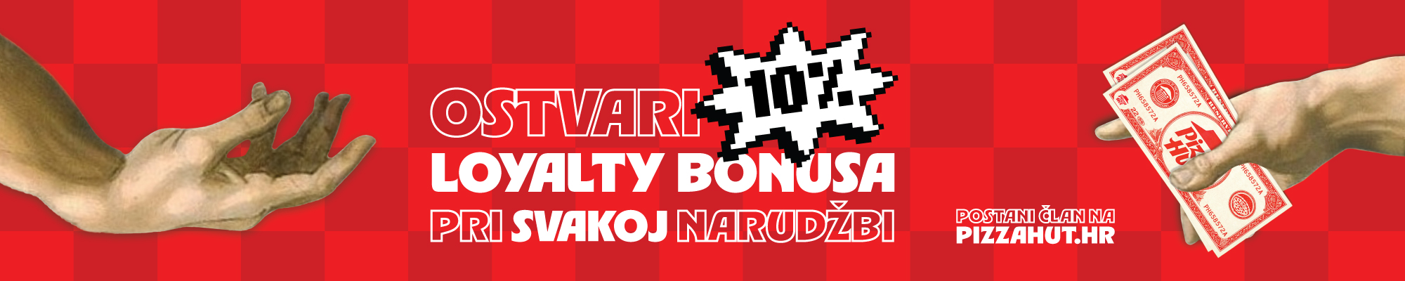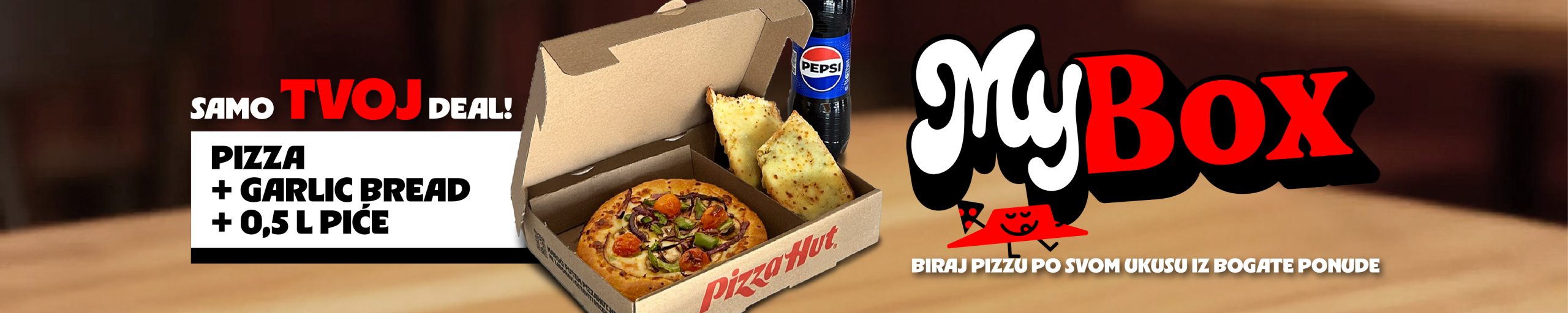 My Box Pizza po izboru + garlic bread + 0,5 L pićeValentinovo Deal Pizza je moj love language | do 40% popusta na menije.HUT-TRICK Tri Classic ili PAN pizze po vašem izboru. * Navedena promotivna cijena vrijedi za konzumaciju u Pizza Hut poslovnicama. Cijene za dostavu mogu se razlikovati – točne informacije provjerite prilikom online narudžbe.ME-DEAL Jedna mala pizza po vašem izboru + Garlic Bread + gazirano piće 0.5l. * Navedena promotivna cijena vrijedi za konzumaciju u Pizza Hut poslovnicama. Cijene za dostavu mogu se razlikovati – točne informacije provjerite prilikom online narudžbe.PIZZA DEAL, TI I JA Odberite dvije male pizze, Classic ili Pan + Garlic bread ili Wedges + dva gazirana pića 0,5 l po izboru. * Navedena promotivna cijena vrijedi za konzumaciju u Pizza Hut poslovnicama. Cijene za dostavu mogu se razlikovati – točne informacije provjerite prilikom online narudžbe.UZMI DVIJE Dvije srednje Classic ili Pan pizze po tvom izboru. * Navedena promotivna cijena vrijedi za konzumaciju u Pizza Hut poslovnicama. Cijene za dostavu mogu se razlikovati – točne informacije provjerite prilikom online narudžbe.